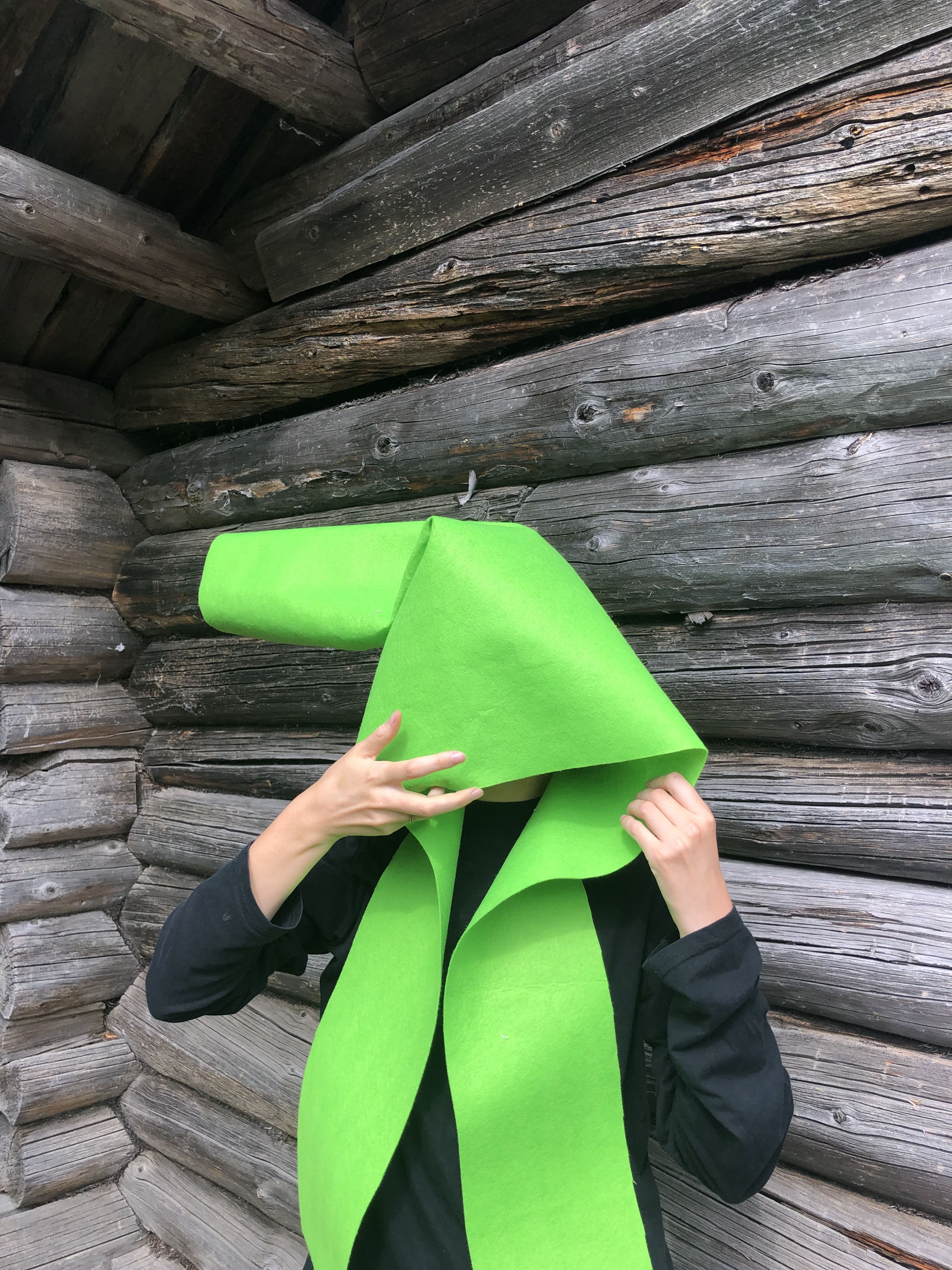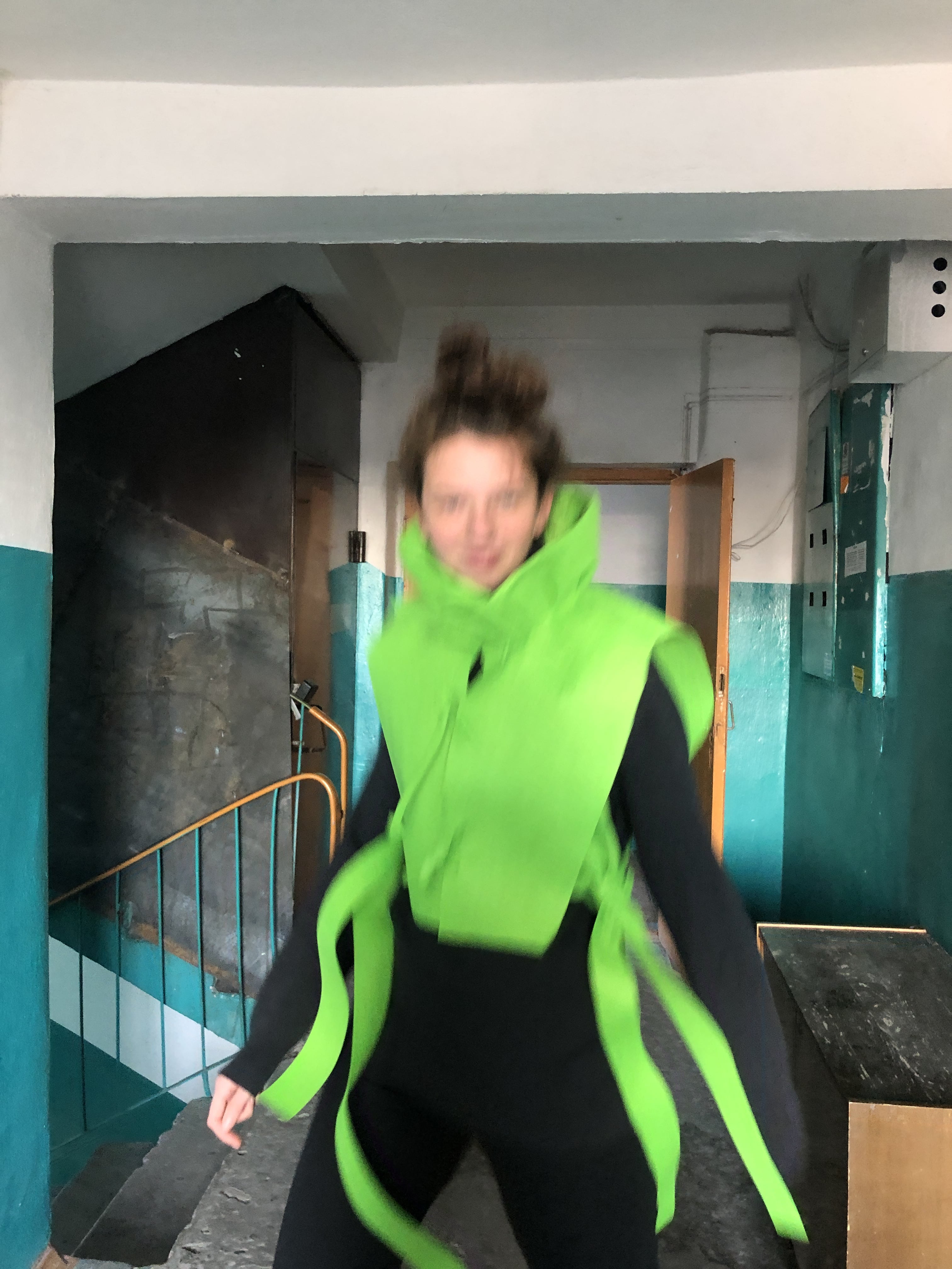 Moreover, the garments appear alien and out of place in the unchanging rural environment due to their vibrant, neon-like colors.